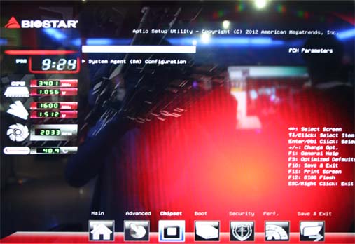바이오스타 (BIOSTAR ) B85 보드 설정법 1. 부팅시 [Delete] 키를 클릭 하여 Bios Setup 화면을 이동 합니다. 2. 아래 메뉴 중 3번째 메뉴 중 Chipset 으로 마우스 이동 합니다. (마우스/방향키 사용) 첫 번째 메뉴 선택 [Enter] . (방향키 사용)
