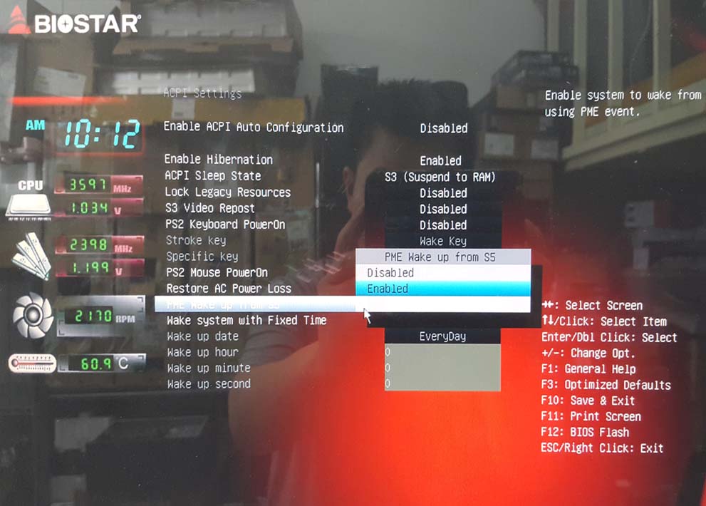 3. 11번째 메뉴 [PMW Wake up from S5]를 선택하여 [Enter] 하여 아래 그림 처럼 실행[Enabled]를 선택하여 주세요.