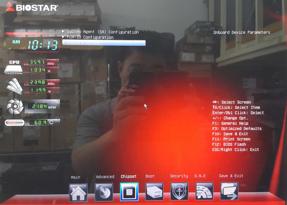 4. 아래 메뉴 중 3 번째 메뉴 인 [Chipset] 를 후 위 매뉴중 3번째 메뉴 [Onboard Device]를 선택하여 [Enter] 합니다.