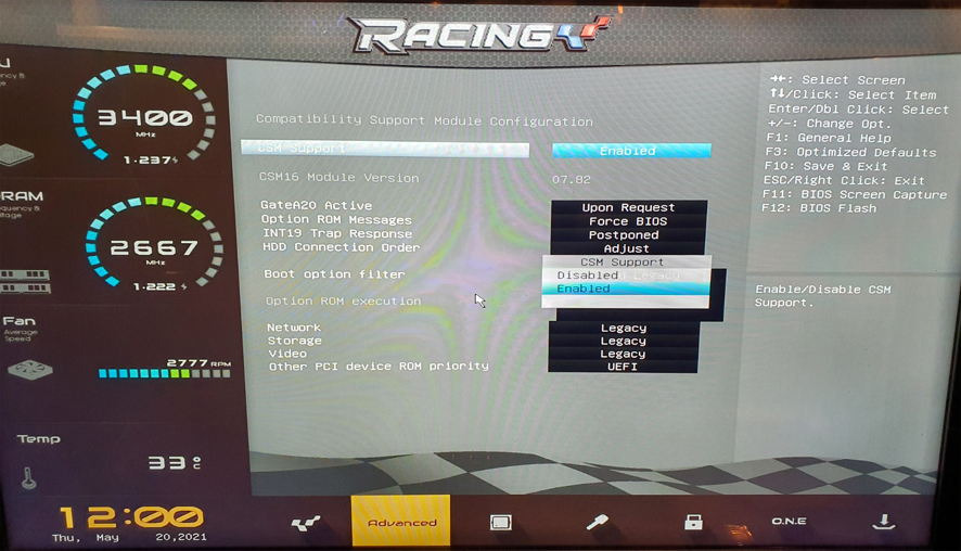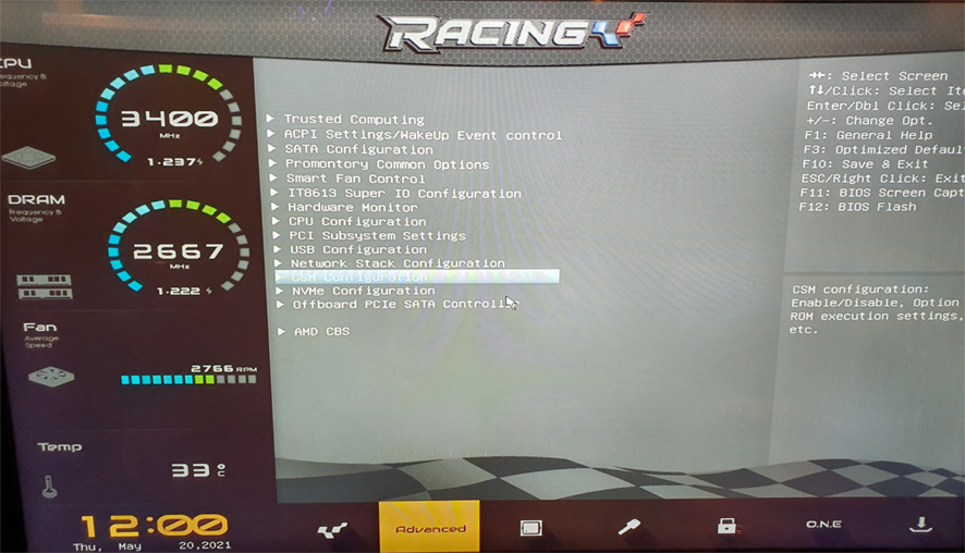 2. 아래 메뉴 중 2번째 메뉴인 [Advanced]를 선택후 아래 매뉴중 12번째 [CSM Configuration]를 선택하여 [Enter] 합니다.