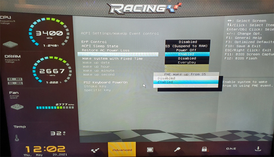 5. 아래 메뉴 4번째 [PME Wakeup up from S5] 선택 하여 [Enter] 하시고 아래 그림 처럼 실행[Enabled]를 선택하여 주세요.