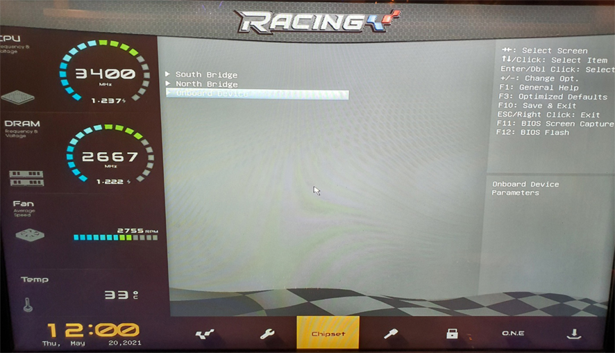 6. [Esc] 으로 처음 메뉴중 3번째 [Chipset] 선택 하여 위 매뉴중 3번 째 [Onbord Device]에서 [Enter] 해 주세요.