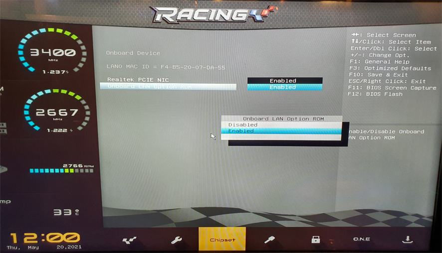 7. 2번째 [Onbord LAN Option ROM]을 선택 하여 [Enter] 하시고 아래 그림 처럼 실행[Enabled]를 선택하여 주세요.