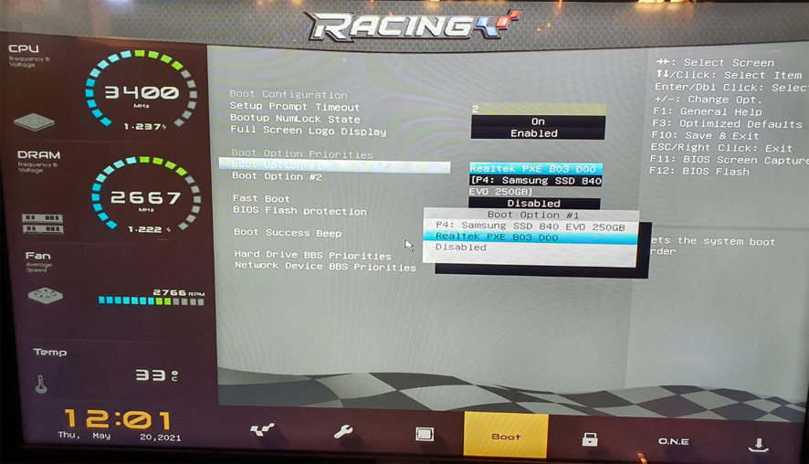8. [Esc] 로 이동하여 아래 메뉴 4번째 [Boot] 선택하시고 3번째 [Boot Option #1]에서 [Enter]하여 [Realtek PXE B03 DOO] 를 선택 해 주세요.