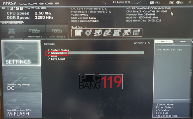 2. [F7]을 눌러 고급모드[Advanced]로 접근해서 왼쪽 메뉴 중 첫번째 메뉴인 [SETTINGS]를 클릭 하세요.