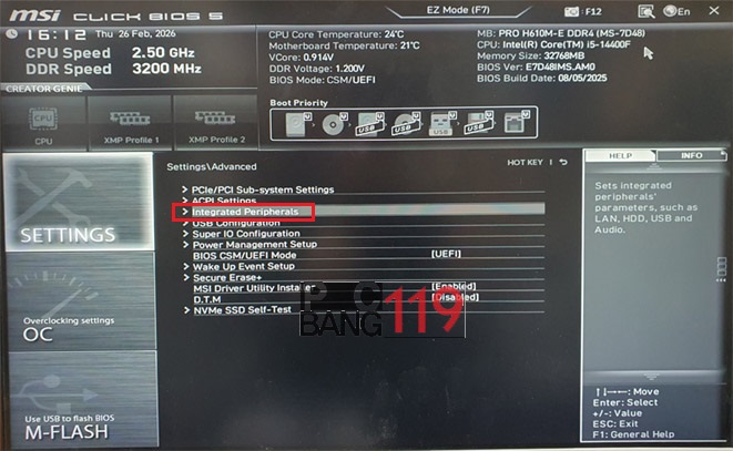 4. [Advanced] 메뉴중 2번째 [Integrated Pertpherals]을 선택 하여 [Enter] 하세요