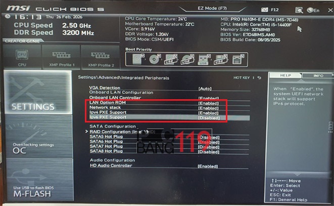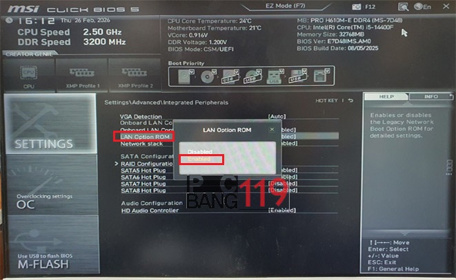 5. 메뉴중 4번째 [LAN Option ROM]을 선택 하여 [Enter] 하시고 아래 그림 처럼 실행[Enabled]를 선택하여 주세요.