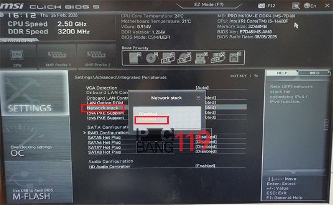 6. 메뉴중 5번째 [Network stack]을 선택 하여 [Enter] 하시고 아래 그림 처럼 실행[Enabled]를 선택하여 주세요.