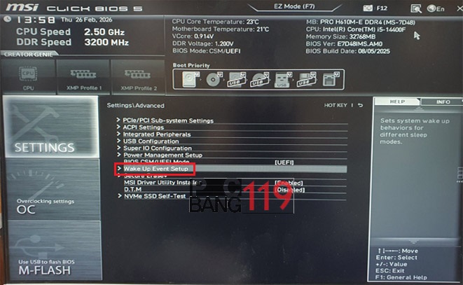 9. [Esc]으로 처음 메뉴중 아래 메뉴 9번째 [Wake Up Event Setup] 선택 하여 [Enter] 해 주세요.