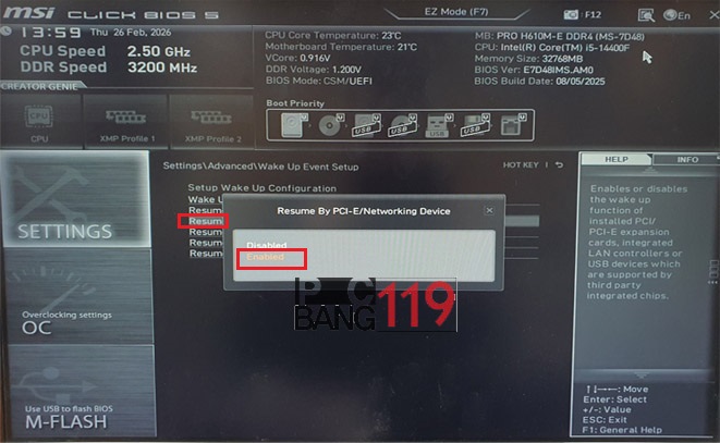 10. 아래 3번째 [Resume By PCI-E/Networking Device] 선택 하여 [Enter] 하시고 아래 그림 처럼 실행[Enabled]를 선택하여 주세요.