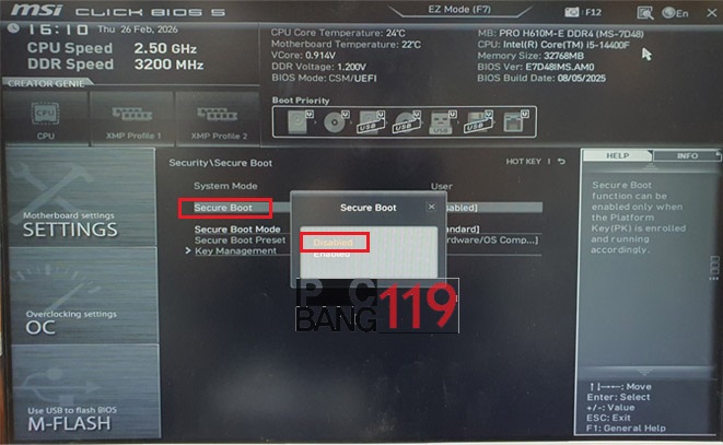 13. 첫번째 [Security Boot]을 선택 하여 [Enter] 하시고 아래 그림 처럼 실행[Disabled]를 선택하여 주세요.