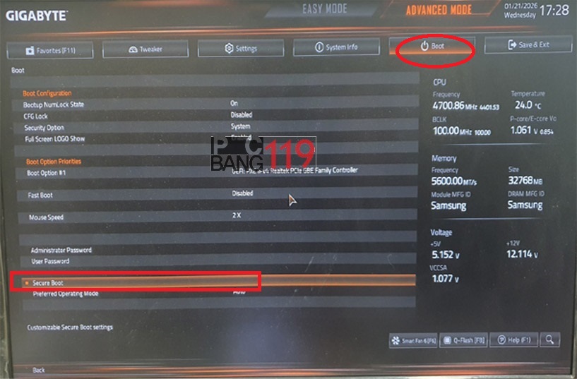3. 위에 메뉴 [Boot] 선택하여 아래 [Secure Boot]를 선택 해 주세요