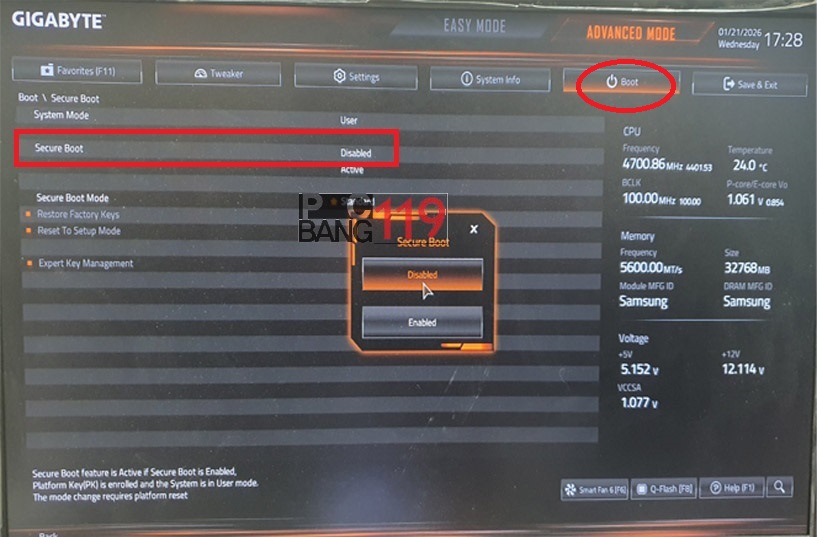 4. 아래 메뉴에서 [Secure Boot] 에서 [Enter] 해 [Disabled]를 선택 해 주세요