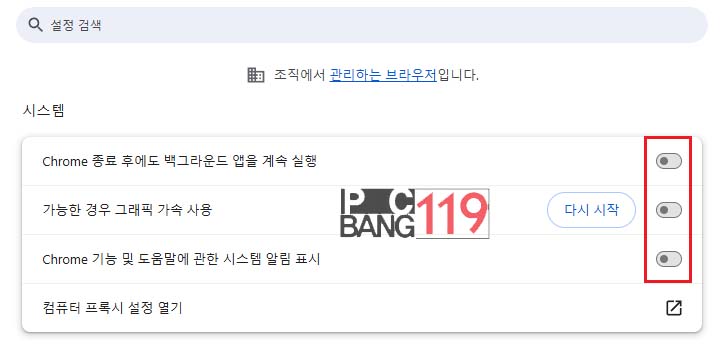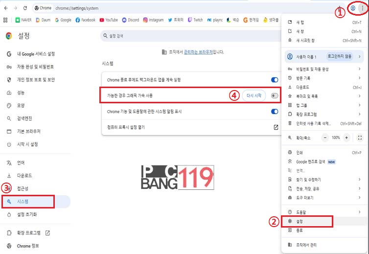 1. 아래와 같이 크롬 사용자 크롬 하드웨어 가속기를 꺼주세요