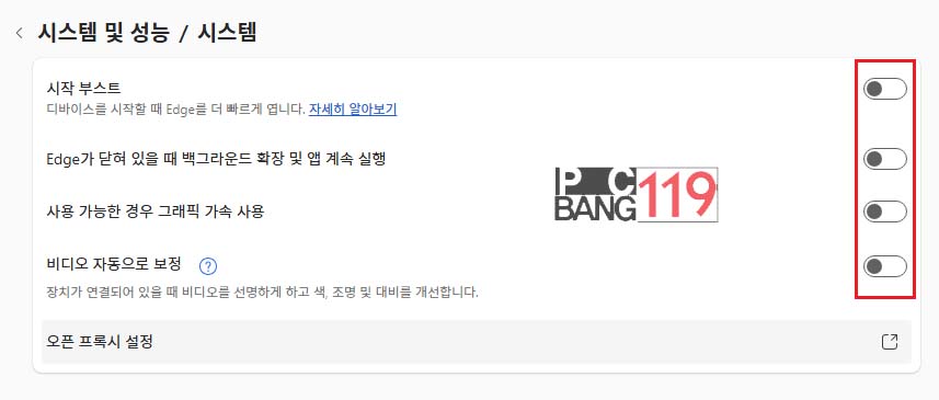 2. 아래와 같이 엣지 사용자 엣지 하드웨어 가속기를 꺼주세요