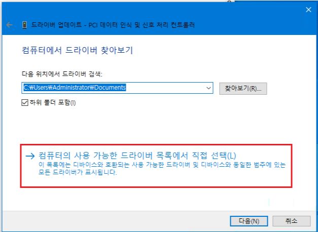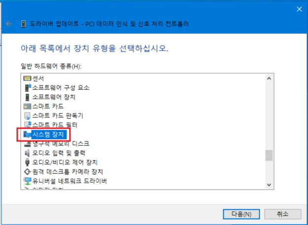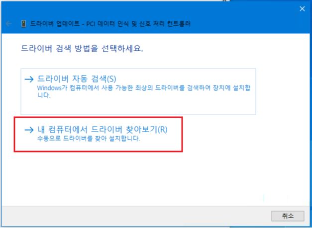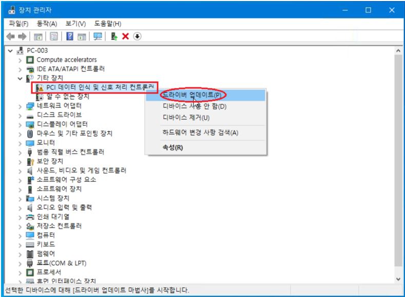 1. 위에 그림처럼 [PCI 데이터 인식 및 신호 처리 컨트롤러]에 오른쪽 마우스 해서 [드라이버 업데이트]를 선택 합니다.