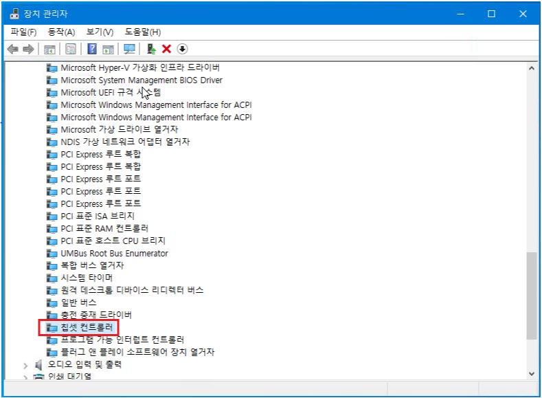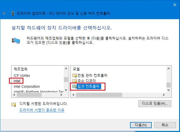 5. 아래 [드라이버 업데이트] 창에서 [Intel] > [칩셋 컨트롤러] or [Chipset Controller]를 선택 합니다.