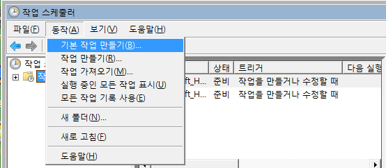2. [작업 스케줄러]창에서 동작 > 기본작업 만들기(B) 를 선택하세요