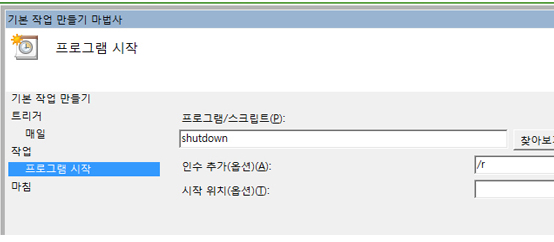 5. [프로그램 시작]에서 저의는 재부팅을 하기때문에 [shutdown] 옵션 [/r]을 입력합니다.