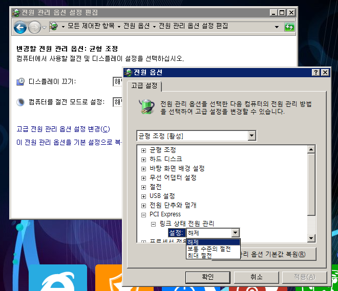 3. PCI Express > 링크 상태 정원 관리 > 설정 을 해제 해주세요