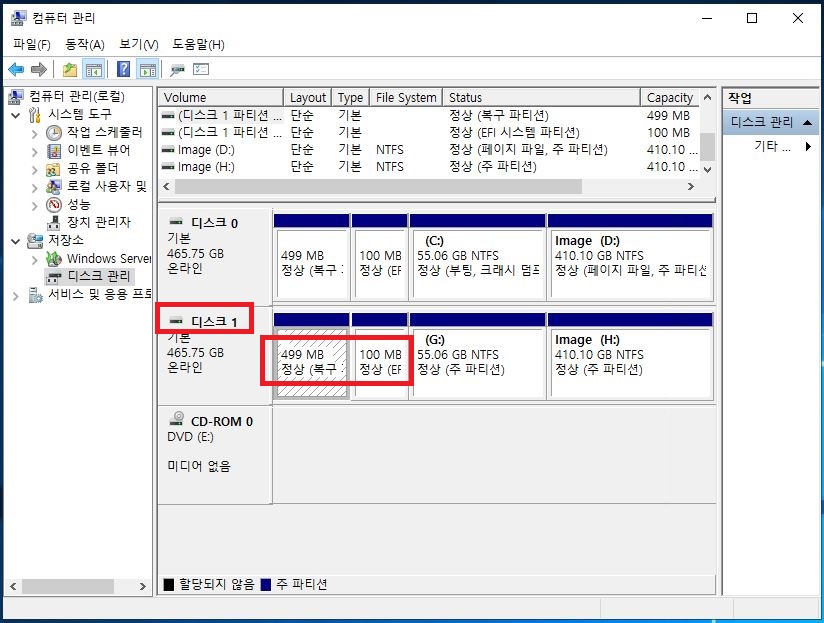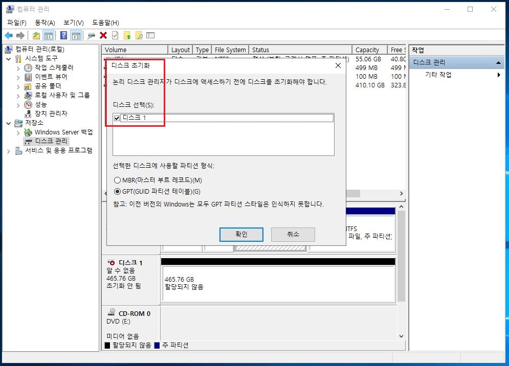컴퓨터 관리에서 확인하면 아래와같이 초기화 되어 있다.