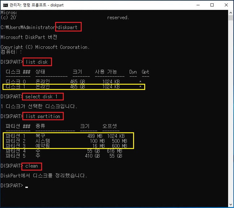 - 도스창(cmd) 에서 diskpart 을 입력하여 [DISKPART] 로 진입니다. - list disk 을 입력하여 디스크를 확인을 합니다. - select disk [1] 삭제 해야할 디스크의 번호를 입력하여 선택을 합니다. - list partition 을 입력하여 복구 파티션을 확인하여 디스크 다시 한번 확인한다. - clean 을 입력하여 모든 파티션을 초기화 한다.