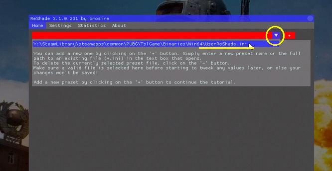 리쉐이드 설정화면에서 선택 [ ▼ ] 를 클릭 하여 미리 설정된 [UserReShade.ini] 를 선택하여 주세요.