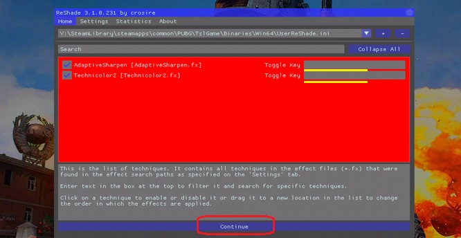 리쉐이드 설정화면에서 [ Toggle Key ] 를 원하시면 설정하시고 [Continue] 를 클릭 하십시오