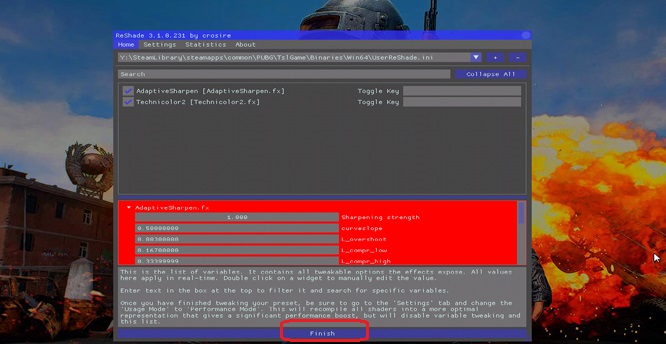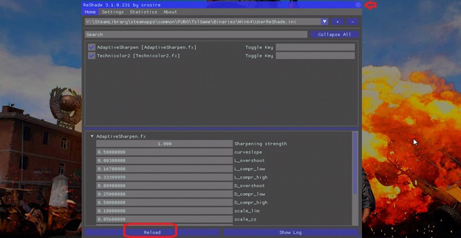 리쉐이드 설정화면에서 [Reload] 를 클릭하시고 오른쪽 위 [●] 클릭하여 닫으시고 게임을 하십시오